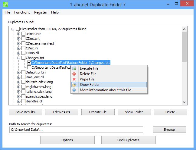 - Decide by your own if you want to ignore, execute or delete found duplicate files