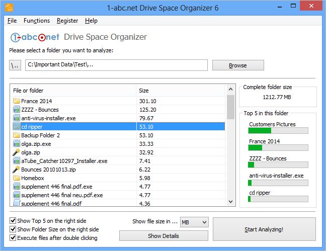 - Summary area on the screen with complete folder size and top 5 of disk space consuming files and folders